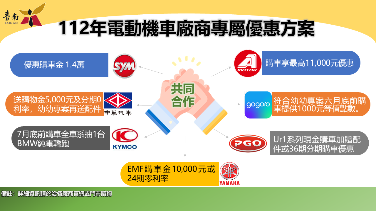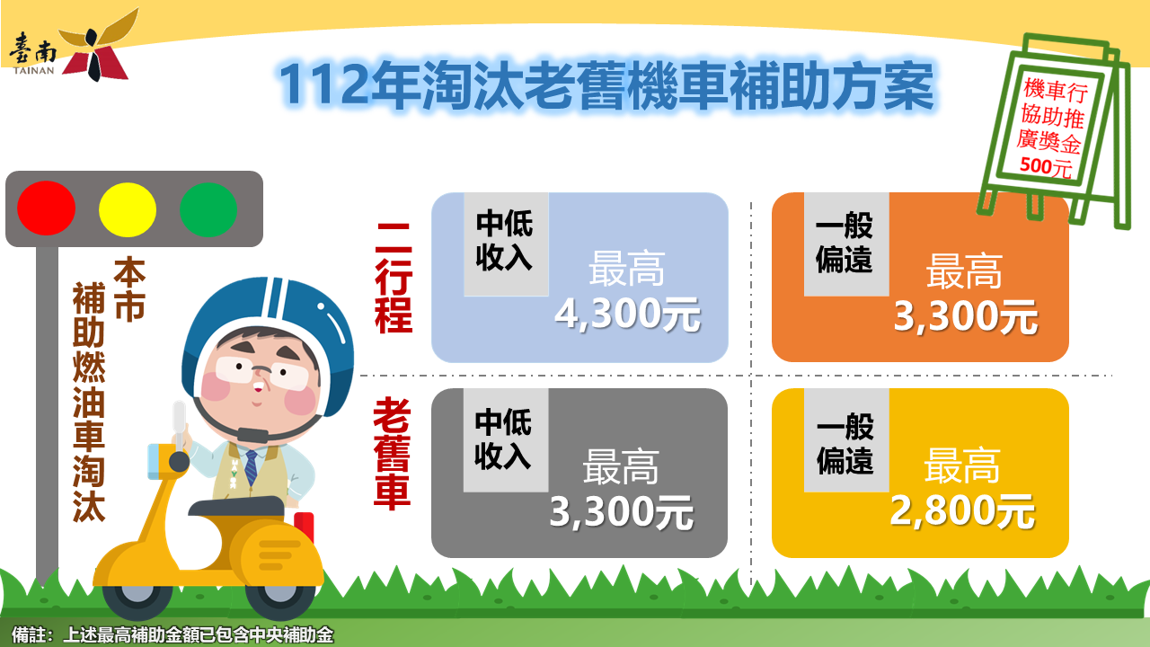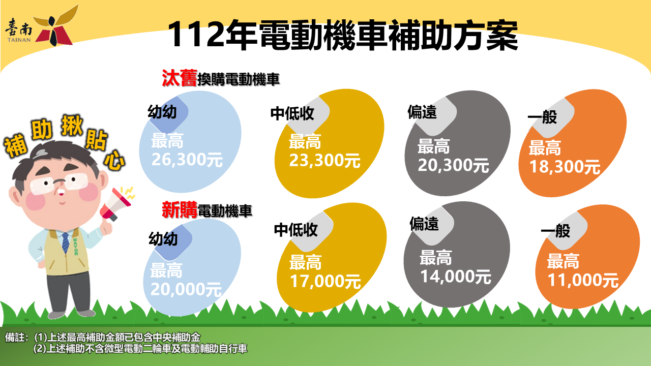 公告「112年臺南市淘汰老舊機車及換、新購電動二輪車補助方案」本市補助金額、種類、對象、數量及相關規定。