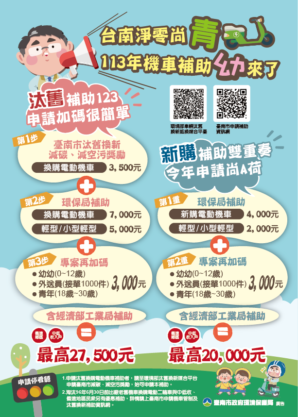臺南市環保局今(28)日舉辦「臺南淨零尚"青" 電車補助"幼"來了」記者會,由市長黃偉哲宣布113年補助方案;除了延續貼心有感的幼幼專案,更因應本市淨零永續城市管理自治條例草案規定,為鼓勵外送員騎乘電動運具,全國首創補助外送員並針對青年族群推出加碼優惠。環保局提醒,申請補助請先上環境部汰舊換新媒合平台選擇抵換交易範圍為「臺南市」,加上汰舊換購補助最高達27,500元,邀市民減碳減空污換現金。